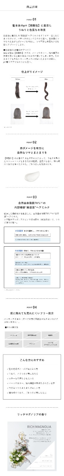 重點1:專注於秀髮的天然pH值(弱酸性),改善毛躁和褪色,讓秀髮更健康。